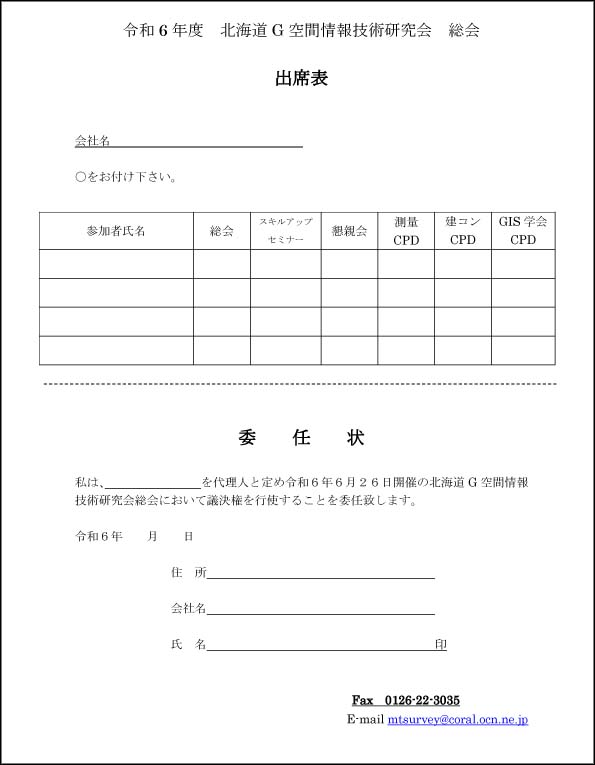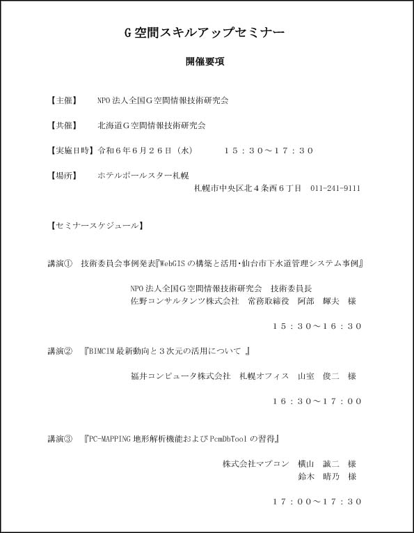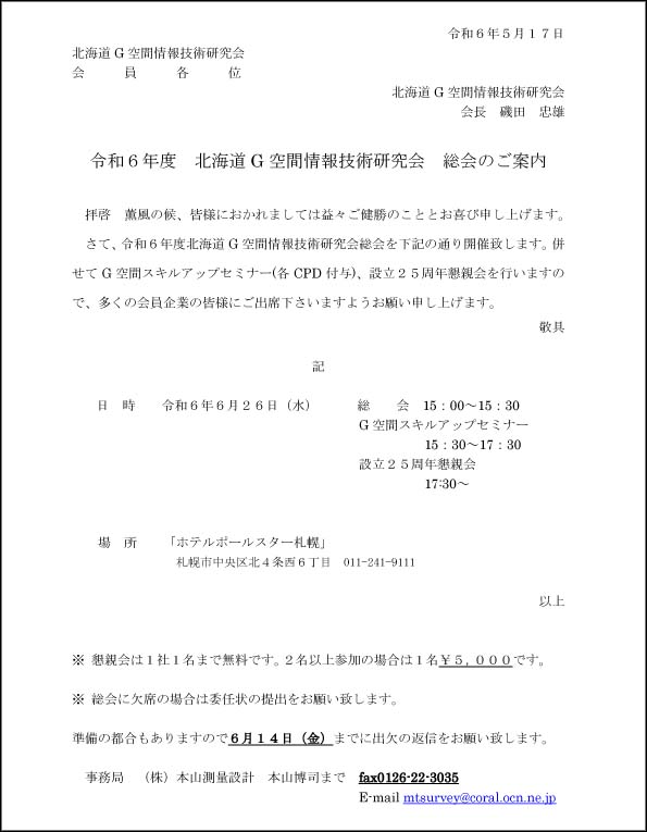 北海道G空間情報技術研究会 会員各位 『令和6年度 北海道G空間情報技術研究会 総会』 を開催致します。 併せて、 『G空間スキルアップセミナー』と 『設立25周年 懇親会』 を行いますので、多くの会員企業の皆様に ご出席下さいますようお願い申し上げます。 右の画像をクリックするとPDFが表示されます→→→ お使いのブラウザの状況によりPDF表示ができない場合は このリンクを右クリックし「対象をファイルに保存」で ダウンロードしてください ◆ 実施日時 令和6年6月26日(水) 総 会 15:00 ~ 15:30 セミナー 15:30 ~ 17:30 懇親会 17:30 ~ ◆ 場所 「ホテルポールスター札幌」 札幌市中央区北4条西6丁目 011-241-9111 → アクセスについてはこちらから |