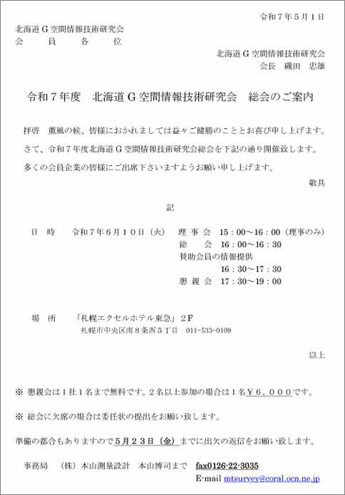 北海道G空間情報技術研究会 会員各位 『令和7年度 北海道G空間情報技術研究会 総会』 を開催致します。 併せて、『懇親会』を行いますので、 多くの会員企業の皆様に ご出席下さいますようお願い申し上げます。 右の画像をクリックするとPDFが表示されます→→→ お使いのブラウザの状況によりPDF表示ができない場合は このリンクを右クリックし「対象をファイルに保存」で ダウンロードしてください ◆ 実施日時 令和7年6月10日(火) ・理事会(理事のみ) 15:00 ~ 16:00 ・総会 16:00 ~ 16:30 ・賛助会員の情報提供 16:30 ~ 17:30 ・懇親会 17:30 ~ 19:00 ◆ 場所 「札幌エクセルホテル東急」 2F 札幌市中央区南8条西5丁目 011-533-0109 → アクセスについてはこちらから |
