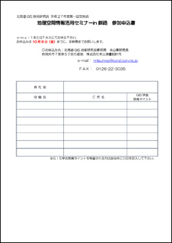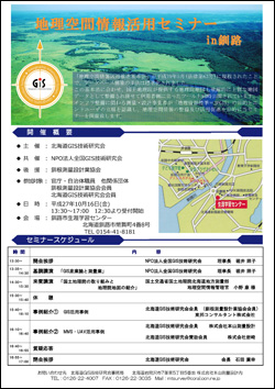北海道GIS技術研究会会員各位 平成27年度第1回定例会を10月16日(金)に 釧路にて開催致します。 定例会に参加を希望される会員の方は お手数ですが当研究会事務局まで、 ご連絡下さい。 右の画像をクリックするとPDFが表示されます→→→ お使いのブラウザの状況によりPDF表示ができない場合は このリンクを右クリックし「対象をファイルに保存」で ダウンロードしてください ・実施日時 平成27年10月16日(金) 13:30~17:00 ・場所 釧路市生涯学習センター 釧路市幣舞町4番28号 → アクセスについてはこちらから |