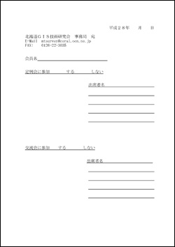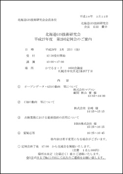 北海道GIS技術研究会会員各位 平成27年度第2回定例会を3月25日(金)に かでる2・7で開催致します。 定例会に参加を希望される会員の方は お手数ですが当研究会事務局まで、 ご連絡下さい。 右の画像をクリックするとPDFが表示されます→→→ お使いのブラウザの状況によりPDF表示ができない場合は このリンクを右クリックし「対象をファイルに保存」で ダウンロードしてください ・実施日時 平成28年3月25日(金) 13:00~17:00 12:30受付開始 ・場所 かでる2・7 1050会議室 札幌市中央区北2条西7丁目 → アクセスについてはこちらから |
