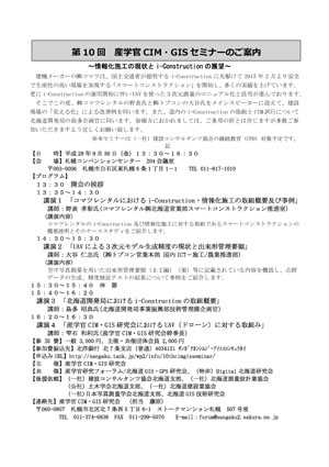 | 北海道GIS技術研究会会員各位 産学官CIM・GIS研究会による 「第10回産学官CIM・GIS セミナー」 開催のご案内を掲載致します。 参加を希望される方はお手数ですが資料に 記載あるフォームよりお申し込み下さい。 右の画像をクリックするとPDFが表示されます→→→ お使いのブラウザの状況によりPDF表示ができない場合はこのリンクを右クリックし「対象をファイルに保存」でダウンロードしてください ・実施日時 平成28年9月30日(火) 13:30~16:30 ・場所 札幌コンベンションセンター 204会議室 札幌市白石区東札幌6条1丁目1-1 → アクセスについてはこちらから |