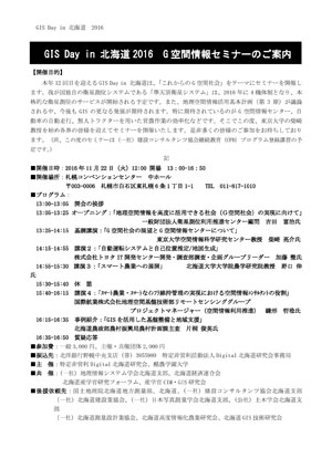 | 北海道GIS技術研究会会員各位 NPO法人Digital北海道研究会・酪農学園大学による 「GIS Day in 北海道2016 G空間情報セミナー」開催のご案内を掲載致します。 参加を希望される方はお手数ですが資料に 記載あるフォームよりお申し込み下さい。 右の画像をクリックするとPDFが表示されます→→→ お使いのブラウザの状況によりPDF表示ができない場合はこのリンクを右クリックし「対象をファイルに保存」でダウンロードしてください ・実施日時 平成28年11月22日(火) 13:00~16:50 ・場所 札幌コンベンションセンター 中ホール 札幌市白石区東札幌6条1丁目1-1 → アクセスについてはこちらから |