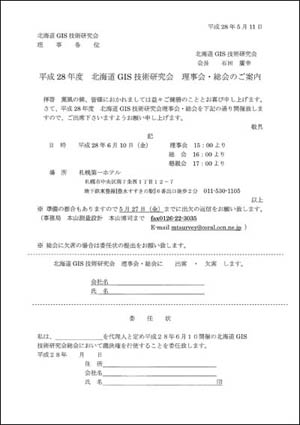| 北海道GIS技術研究会理事各位 平成28年度 北海道GIS技術研究会 総会を開催致しますのでご出席下 さいますようお願い申し上げます。 右の画像をクリックするとPDFが表示されます→→→ お使いのブラウザの状況によりPDF表示ができない場合はこのリンクを右クリックし「対象をファイルに保存」でダウンロードしてください ・実施日時 平成28年6月10日(金) 理事会 15:00より 総 会 16:00より 懇親会 17:00より ・場所 札幌第一ホテル 札幌市中央区南7条西1丁目12-7 → アクセスについてはこちらから |