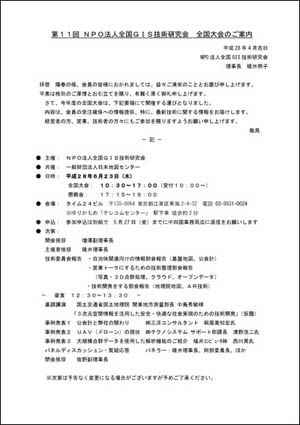 | 北海道GIS技術研究会会員各位 会員の皆様に御案内致します。 NPO法人全国GIS技術研究会全国大会が 別添の日時に開催されます。 参加される皆様は各自で飛行機を手配頂き、確定しましたら懇親会の手配の都合がありますので事務局までご連絡下さい。申し込みは事務局で一括して行います。 右の画像をクリックするとPDFが表示されます→→→ お使いのブラウザの状況によりPDF表示ができない場合はこのリンクを右クリックし「対象をファイルに保存」でダウンロードしてください ・実施日時 平成28年6月23日(木) 全国大会 10:30〜17:00 懇 親 会 17:15〜19:00 ・場所 東京都江東区青海2-4-32 タイム24ビル → アクセスについてはこちらから |