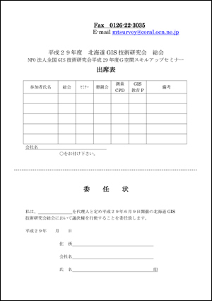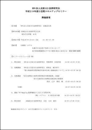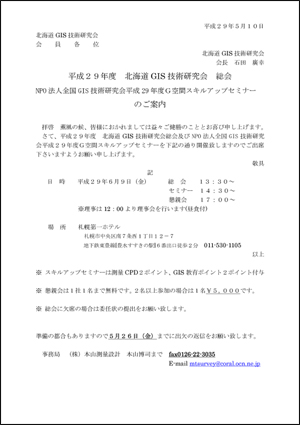 北海道GIS技術研究会会員各位 平成29年度 北海道GIS技術研究会総会及び NPO法人全国GIS技術研究会 平成29年度 G空間スキルアップセミナーを 開催致しますのでご出席下さいますよう お願い申し上げます。 右の画像をクリックするとPDFが表示されます→→→ お使いのブラウザの状況によりPDF表示ができない場合は このリンクを右クリックし「対象をファイルに保存」で ダウンロードしてください ・実施日時 平成29年6月9日(金) 総 会 13:30より セミナー 14:30より 懇親会 17:00より ※理事は12:00より理事会を行います(昼食付き) ・場所 札幌第一ホテル 札幌市中央区南7条西1丁目12-7 → アクセスについてはこちらから |