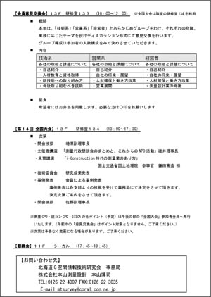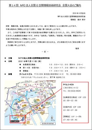 北海道G空間情報技術研究会 会員各位 会員の皆様に御案内致します。 NPO法人全国G空間技術研究会 全国大会が 2019年7月11日(木) に開催されます。 参加される皆様は各自で飛行機を手配頂き、 確定しましたら懇親会の手配の都合がありますので事務局までご連絡下さい。 申し込みは事務局で一括して行います。 ・実施日時